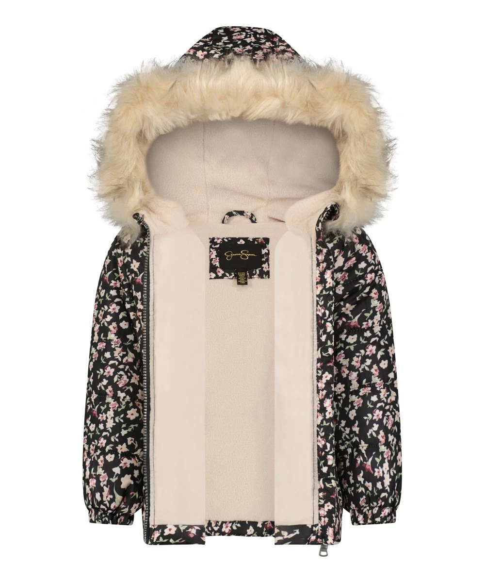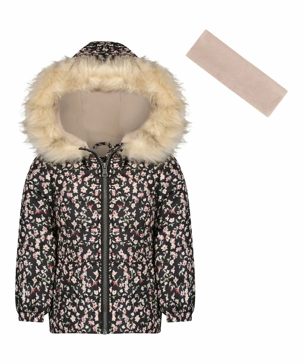 - Includes black floral puffer coat and beige headband (two pieces total)
