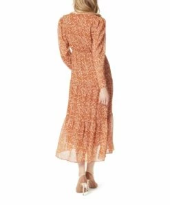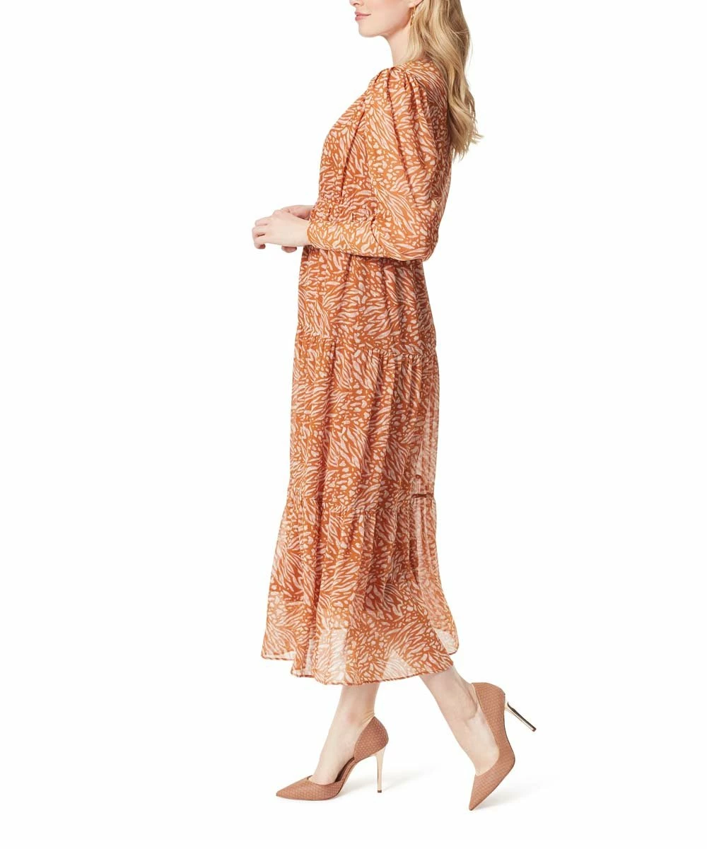This printed dress is designed with a v-neckline and flowing tiered skirt.
