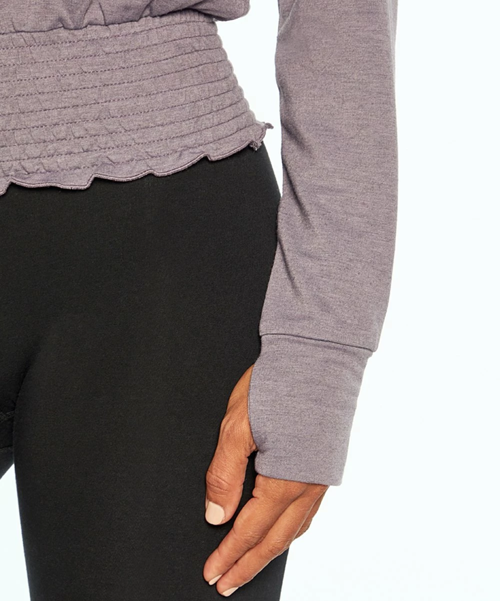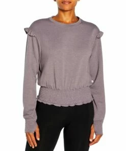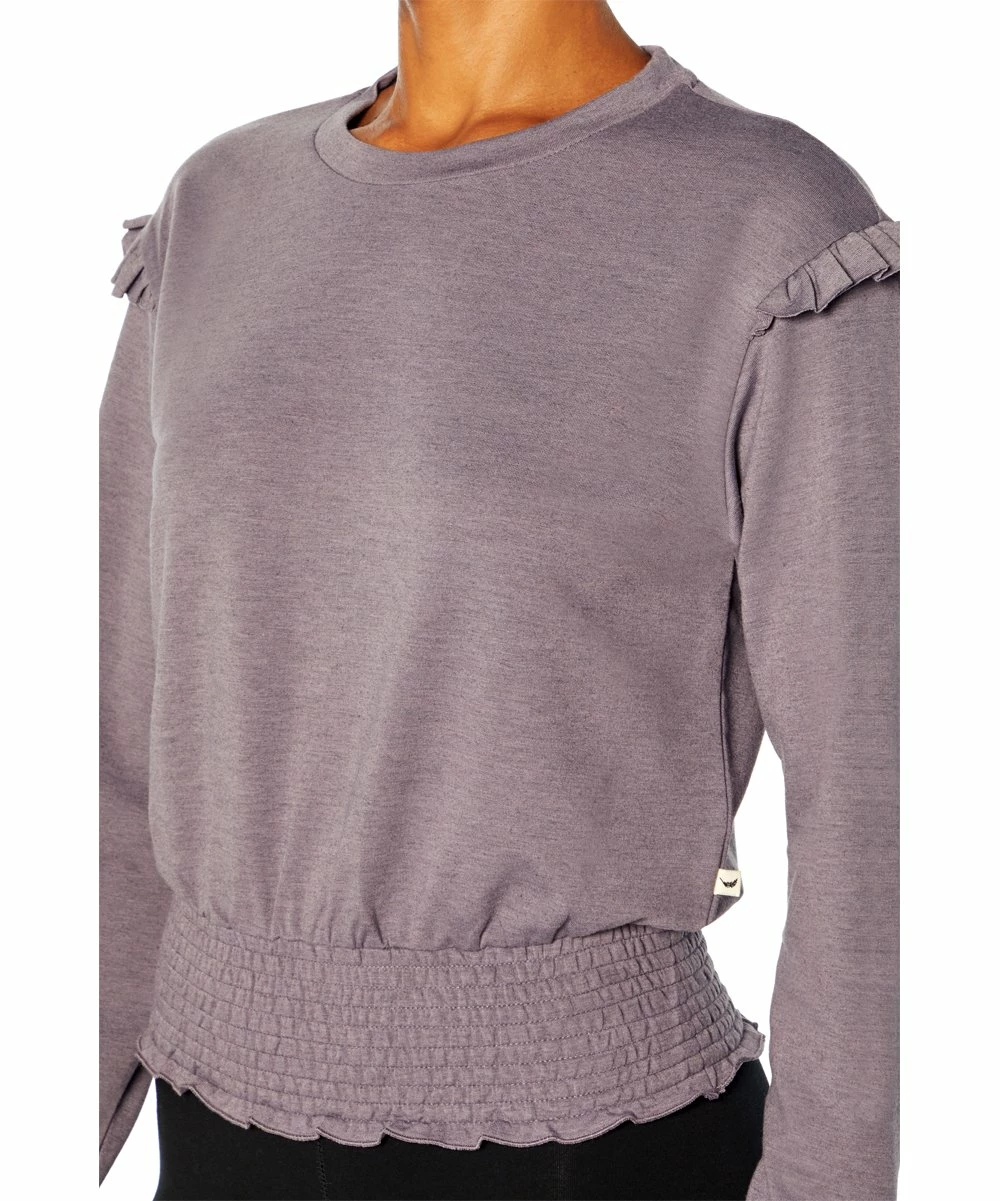Long-sleeve crewneck top featuring ruffles at the shoulders and a touch of stretch.