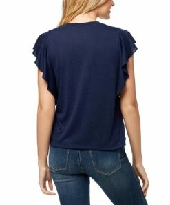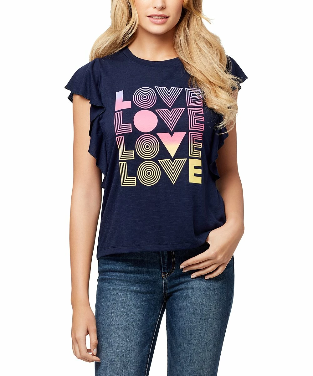 Reinvent your weekend look with this flirty graphic tee flanked by fluttery sleeves.