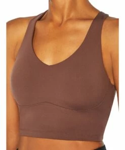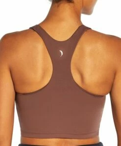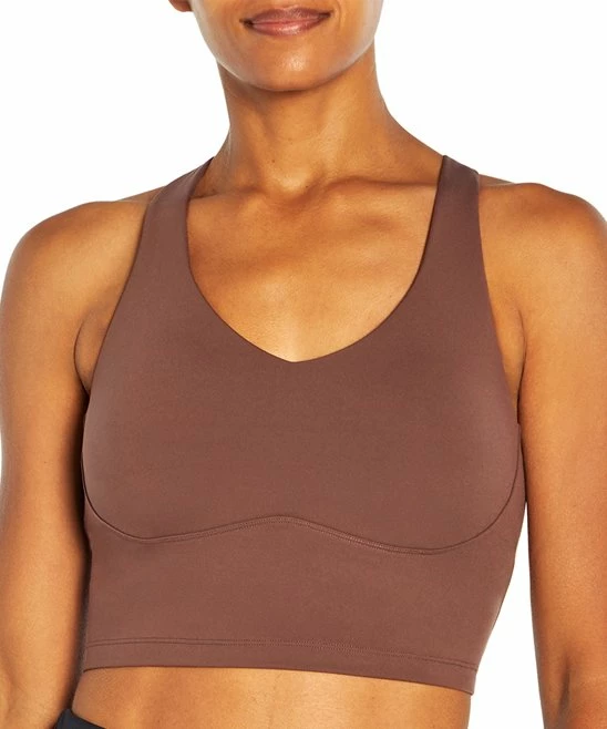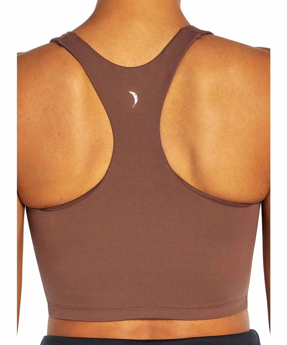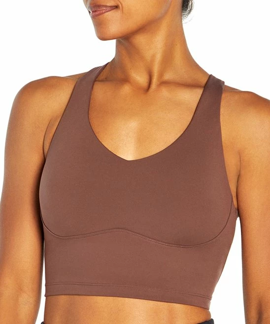 Longline sports bra made with stretch-rich material and a racerback design.