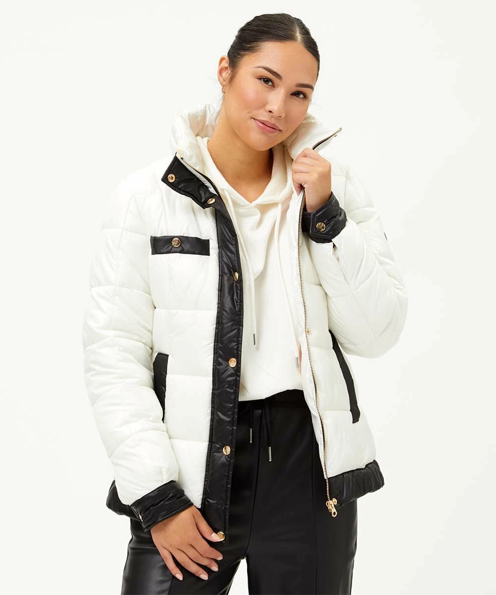 New 😍 Jessica Simpson Off-White & Black Quilted Mock Neck Puffer πŸ§₯ Coat – πŸ‘© Women 🌟