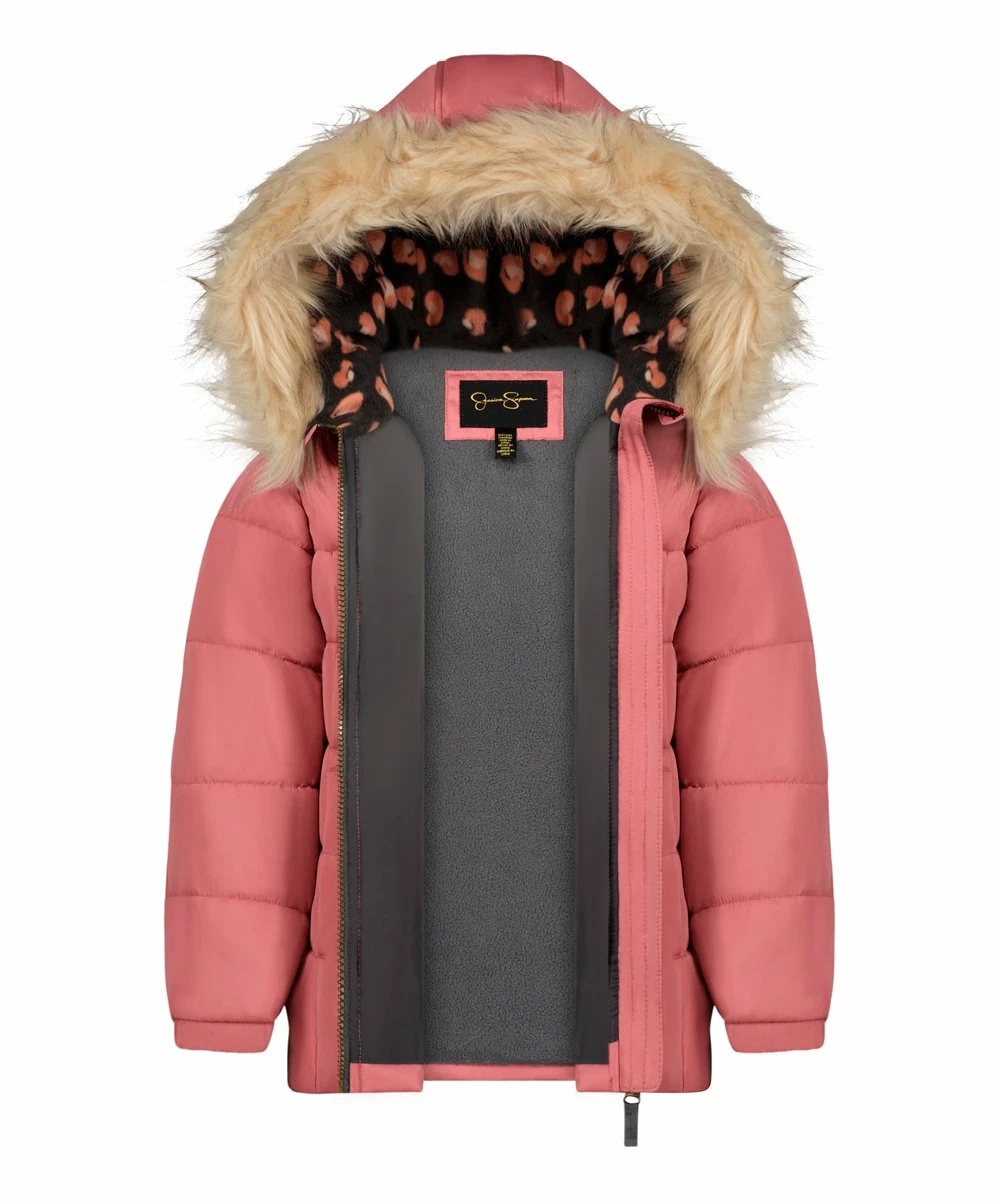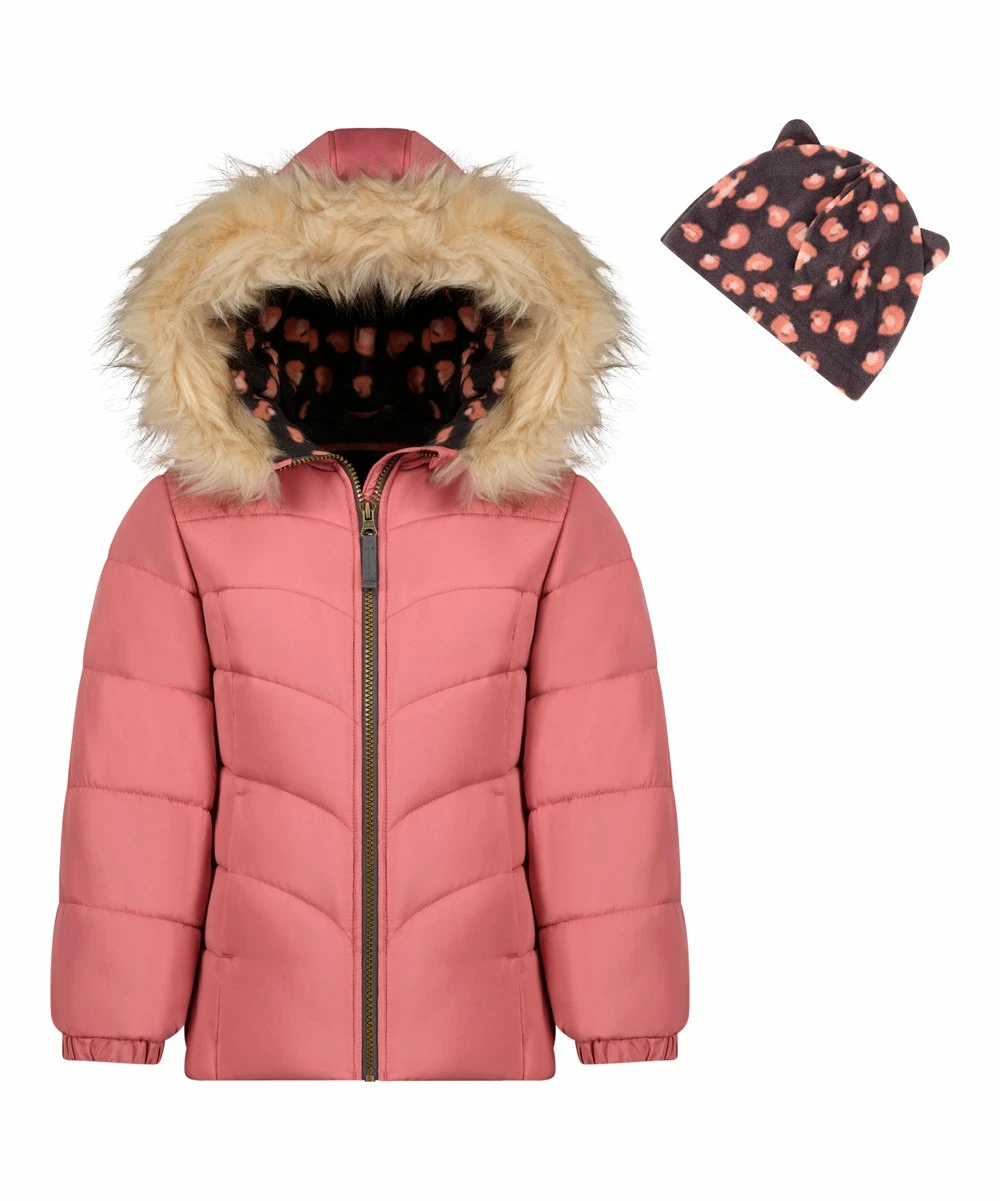 - Includes rose puffer coat and gray and coral leopard animal-ear beanie (two pieces total)