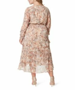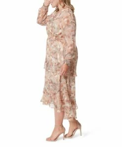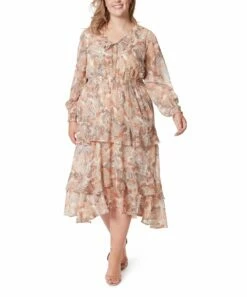 V-neck dress showcasing an elegant tiered design and playful puff sleeves.