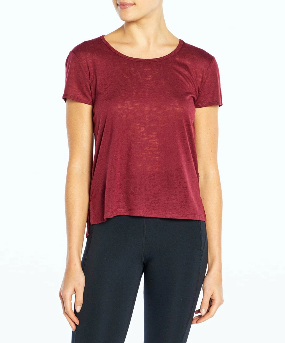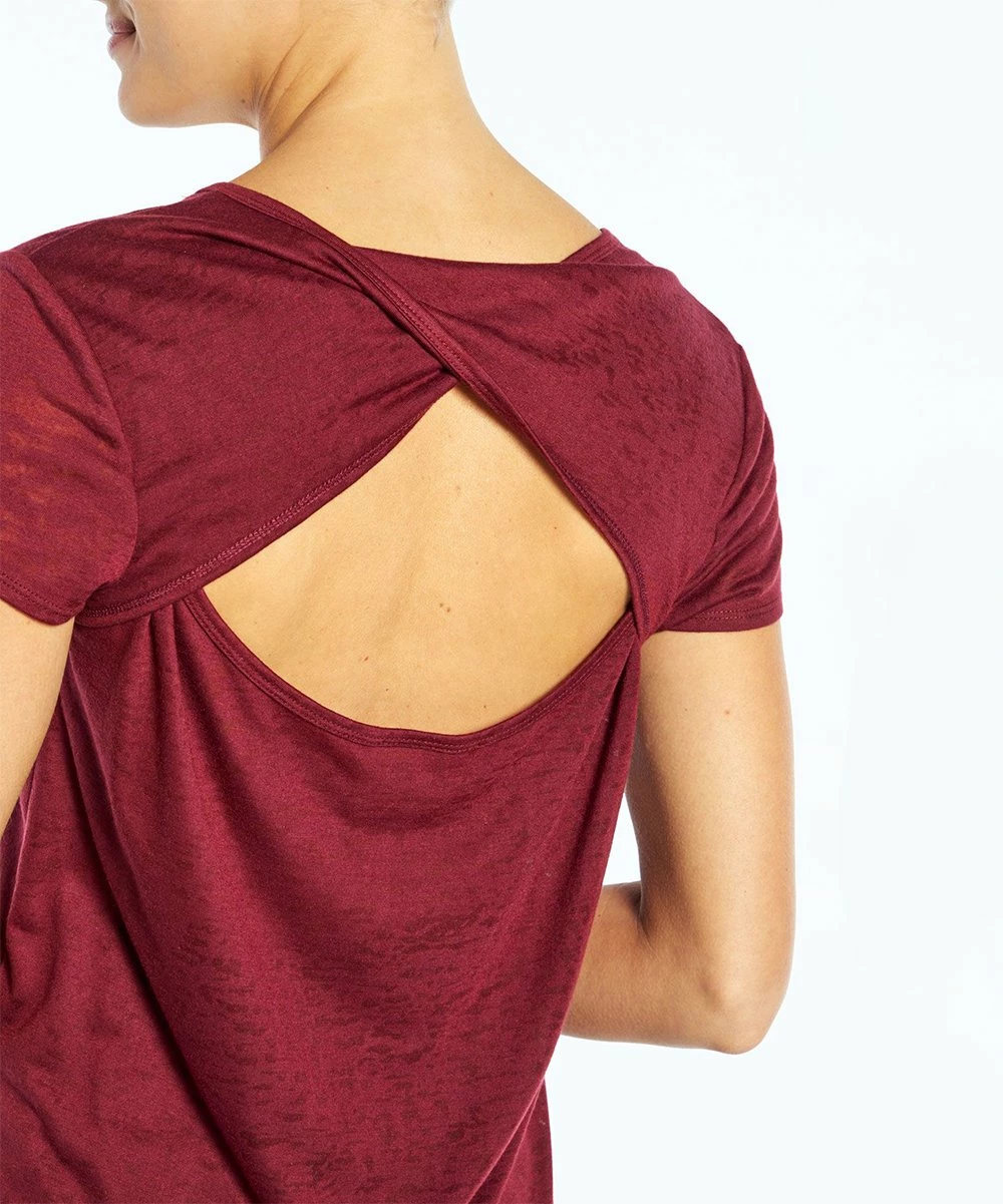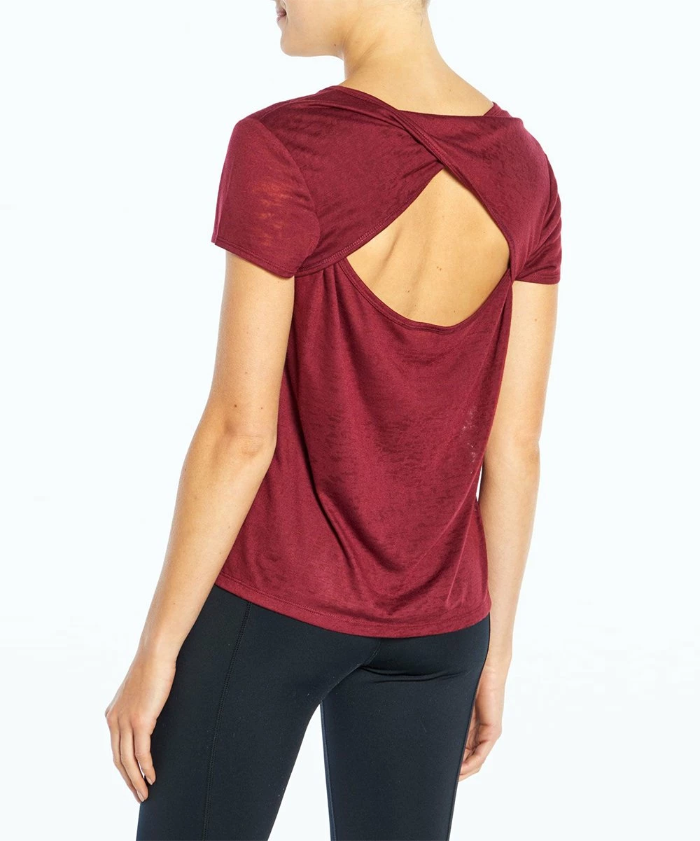 Update your athleisure looks with this scoop neck tee featuring a twisted cutout back and soft, breathable fabric for comfortable weekend wear.